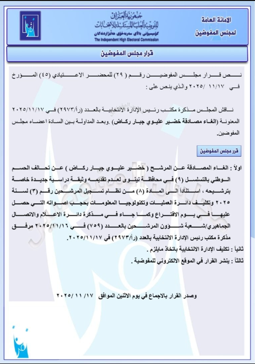 كما شمل الاستبعاد المرشح عن تحالف الحسم الوطني خضير عليوي جبار ركاض لعدم تقديمه وثيقة دراسية جديدة خاصة بترشيحه.