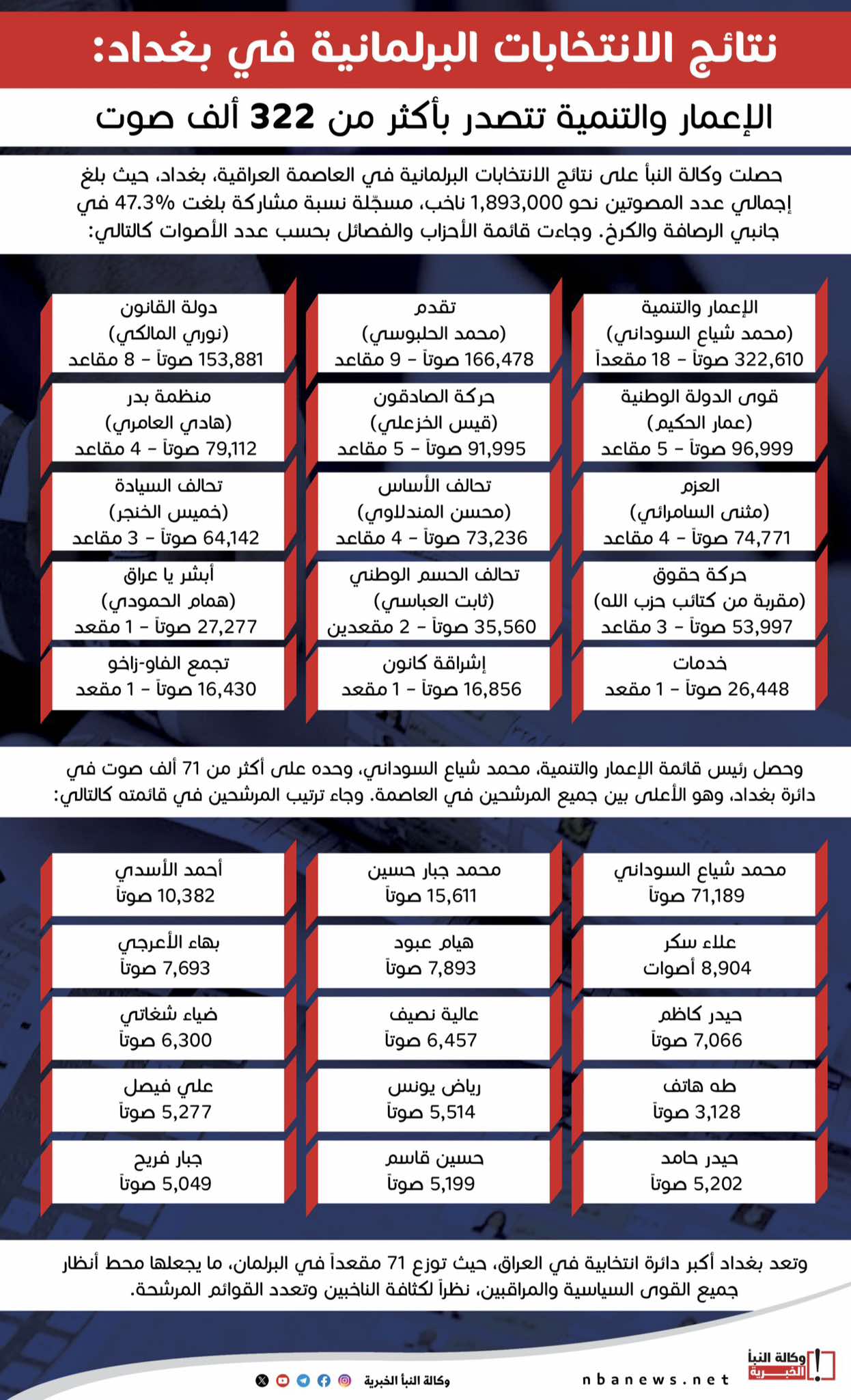 حصلت وكالة النبأ على نتائج الانتخابات البرلمانية في العاصمة العراقية، بغداد، حيث بلغ إجمالي عدد المصوتين نحو 1,893,000 ناخب، مسجّلة نسبة مشاركة بلغت %47.3 في جانبي الرصافة والكرخ. وجاءت قائمة الأحزاب والفصائل بحسب عدد الأصوات كالتالي:
