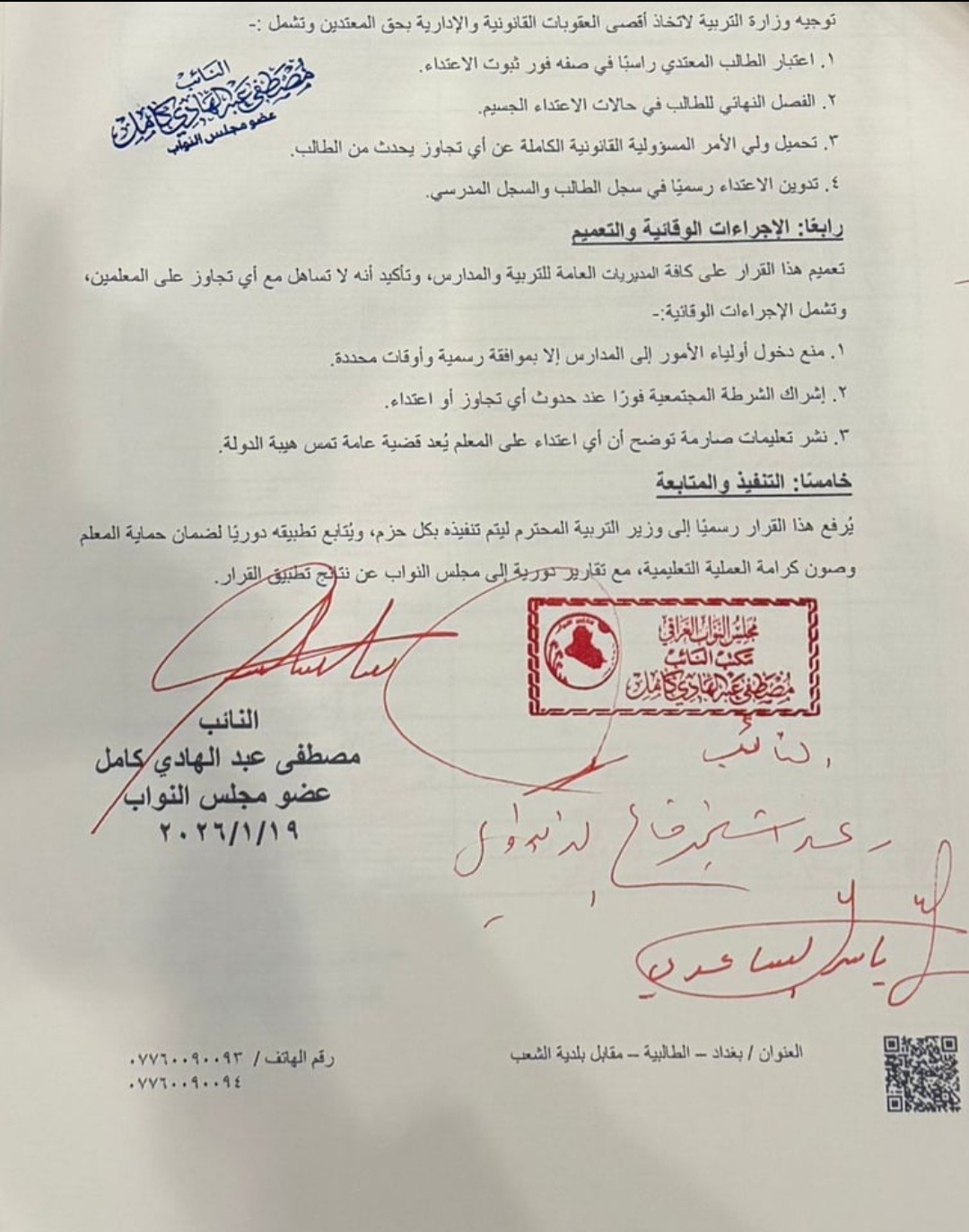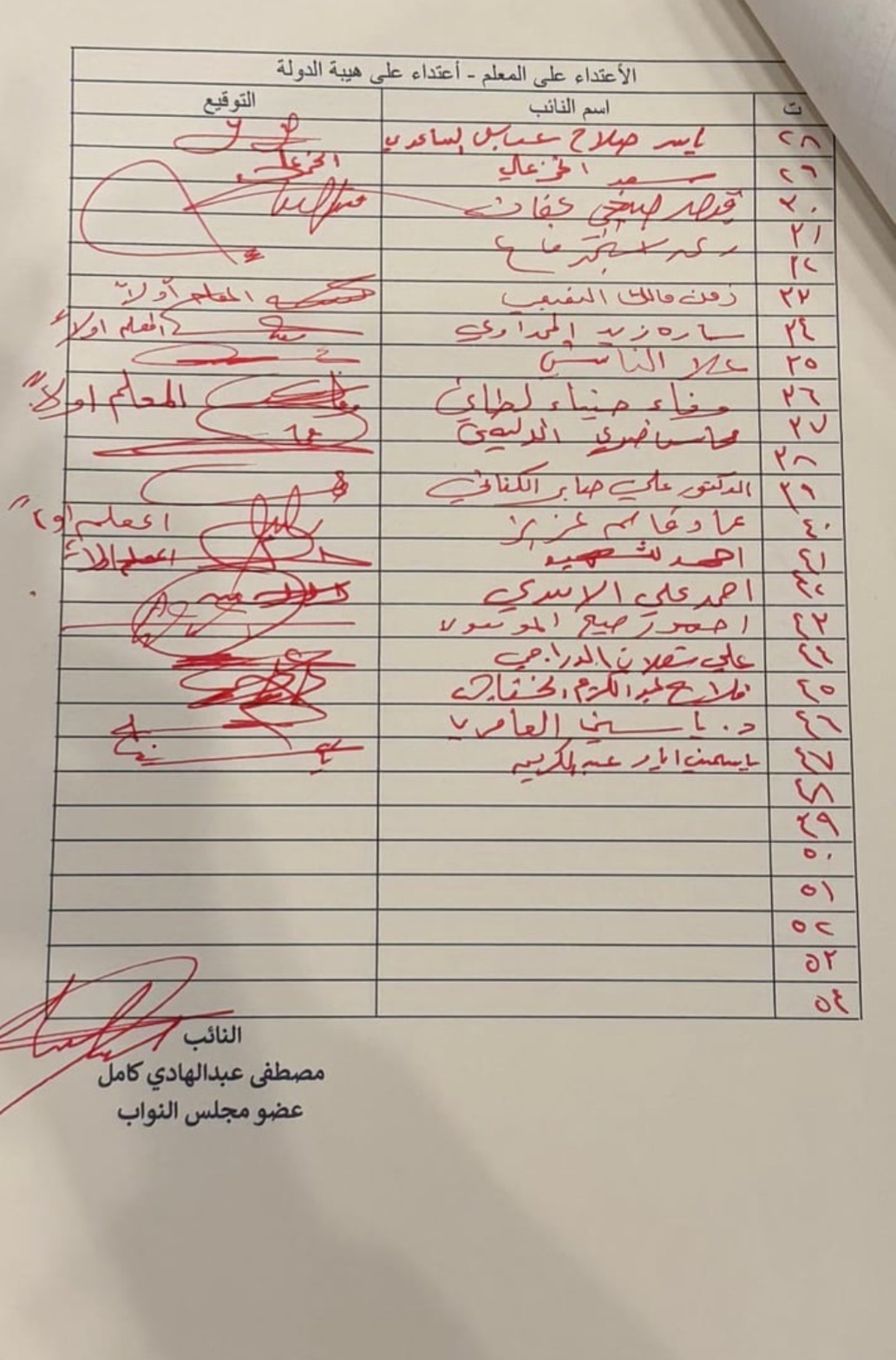 وقّع عدد من أعضاء مجلس النواب، اليوم الاثنين، مقترحاً رسمياً قُدّم إلى رئاسة البرلمان، يتضمن اتخاذ إجراءات قانونية بحق الطلبة أو أولياء الأمور المتورطين بالاعتداء على الملاكات التعليمية.