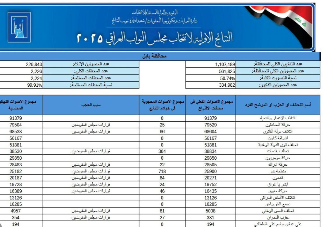 النتائج الأولية للانتخابات النيابية في محافظة بابل
