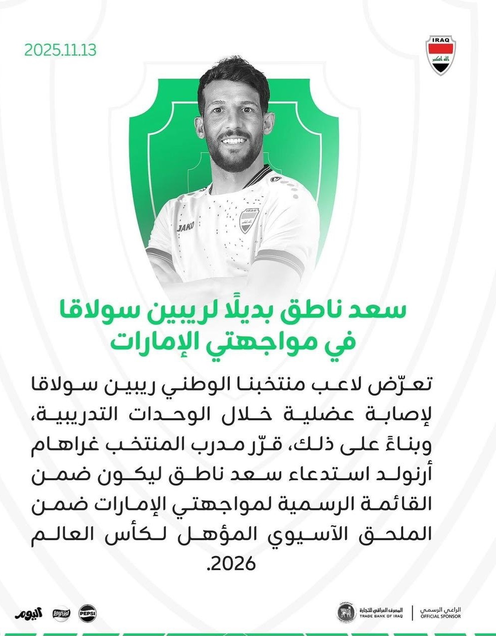 أعلن الجهاز الفني للمنتخب الوطني العراقي، بقيادة المدرب غراهام أرنولد، استدعاء اللاعب سعد ناطق ليحل بديلاً عن المدافع ريبين سولاقا، الذي تعرّض لإصابة عضلية خلال التدريبات التحضيرية لمواجهتي منتخب الإمارات في الملحق الآسيوي المؤهل إلى كأس العالم.