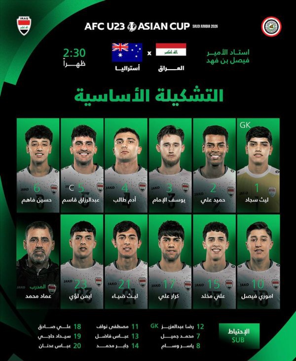 أعلن مدرب المنتخب الأولمبي، اليوم الأربعاء، التشكيلة الرسمية التي ستخوض مواجهة أستراليا ضمن الجولة الثالثة من دور المجموعات لبطولة كأس آسيا تحت 23 عاماً، المقامة حالياً في المملكة العربية السعودية.