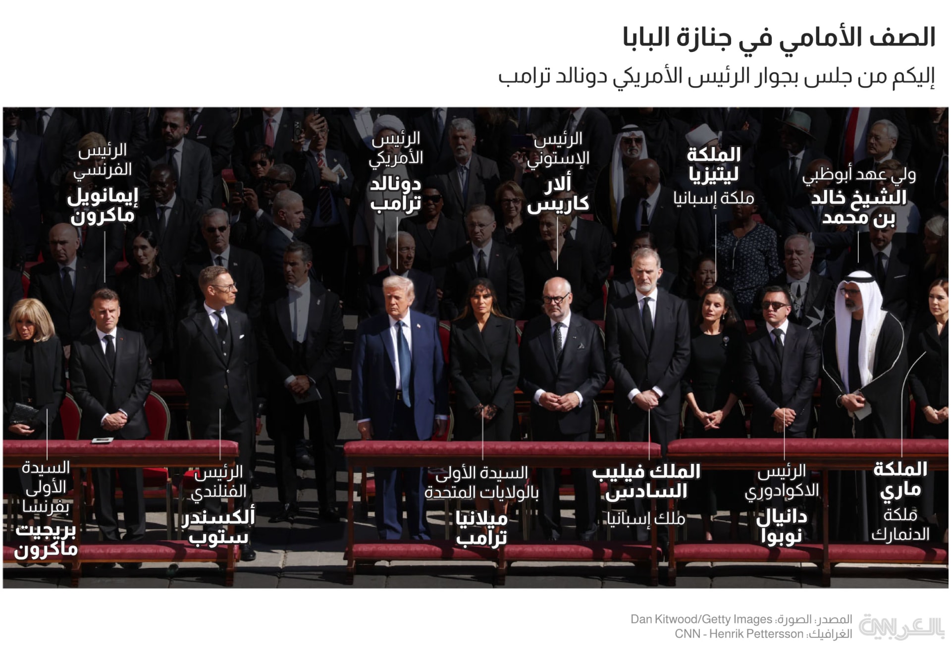 والشخصيات البارزة الوحيدة التي لم تجلس حسب الترتيب الأبجدي هي إيطاليا - الدولة المضيفة - والأرجنتين - مسقط رأس البابا فرانسيس، إذ جلست رئيسة الوزراء الإيطالية جيورجيا ميلوني والرئيس الأرجنتيني خافيير ميلي في المقدمة، مع مجموعة من المسؤولين الآخرين.
