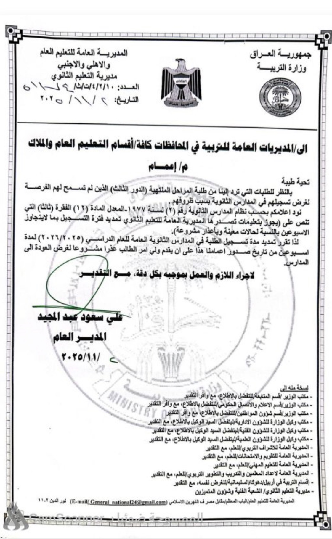 وذكرت الوزارة في بيان تلقته وكالة النبأ، ان " المديرية العامة للتعليم العام والأهلي والأجنبي قررت تمديد مدة تسجيل الطلبة في المدارس الثانوية العامة للعام الدراسي (2026/2025) لأسبوعين من تاريخ صدور الكتاب أدناه".