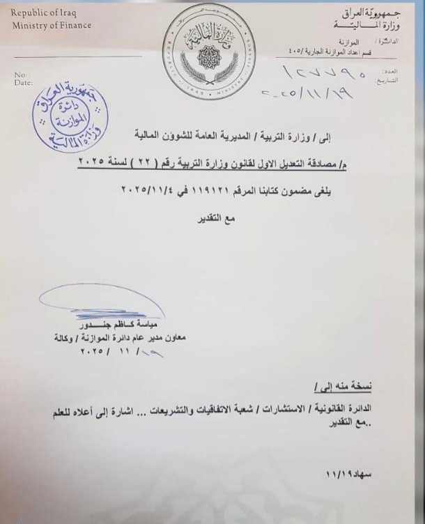 وذكرت الوزارة، في كتاب رسمي تلقت وكالة النبأ نسخة منه، أنها قررت إلغاء مضمون الكتاب المرقم (119121) والصادر في 4 تشرين الثاني 2025، والمرتبط بتفسير أو تنفيذ المادة (4/ثالثاً) من قانون التعديل الأول لقانون وزارة التربية رقم (22) لسنة 2011.