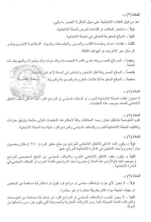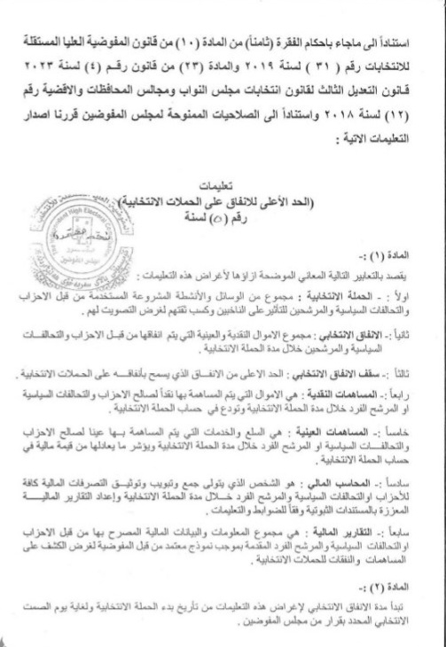 أعلنت المفوضية العليا المستقلة للانتخابات، اليوم الأحد، التعليمات الخاصة بالحد الأعلى للإنفاق على الحملات الانتخابية للمرشحين والقوائم السياسية، وذلك في إطار جهودها لضمان العدالة وتكافؤ الفرص بين المتنافسين.
