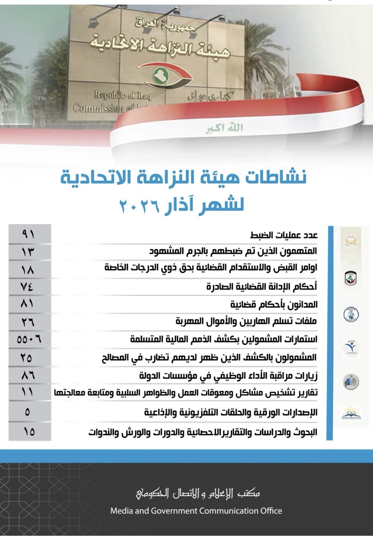 أعلنت هيئة النزاهة، اليوم الخميس، صدور 18 أمر قبض واستقدام بحق ذوي الدرجات الخاصة خلال شهر آذار الماضي.