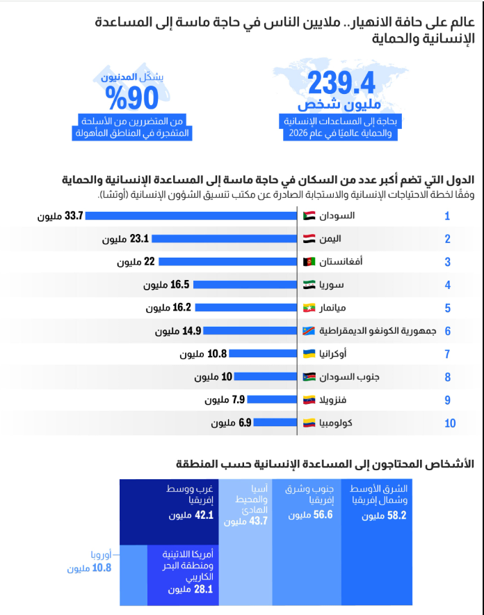 مع بداية عام 2026، يحتاج ما يزيد قليلاً عن 239 مليون شخص بشكل عاجل إلى المساعدة الإنسانية والحماية، وسط صراعات مستعصية تتسم بالعنف ضد المدنيين وتستمر لفترة أطول من أي وقت مضى، منذ الحرب العالمية الثانية، وأزمة مناخية تتصاعد بلا هوادة.