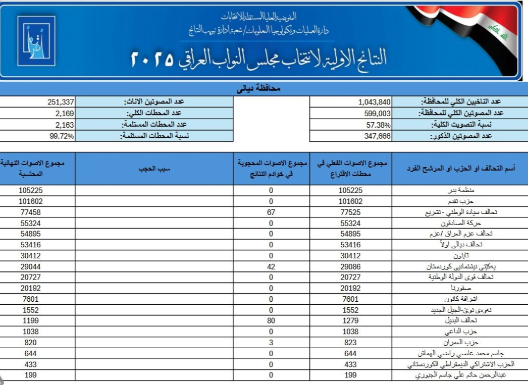 النتائج الأولية للانتخابات النيابية في محافظة ديالى