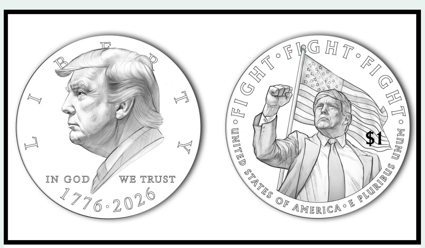 وتُظهر إحدى المسودات صورة لترمب على الوجه الأول من العملة، بينما يظهر على الوجه الآخر رافعاً قبضته أمام العلم الأميركي مع عبارة حارب، حارب، حارب — وهي لقطة مأخوذة من لحظة رفعه قبضته عقب محاولة اغتياله خلال حملته الانتخابية العام الماضي.