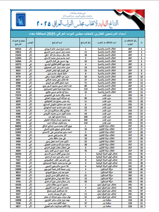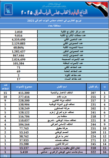 وقالت المفوضية في المؤتمر الصحفي لإعلان النتائج النهائية وتابعته وكالة النبأ أن "نسبة التصويت في العاصمة بغداد تجاوزت 48%، ووزعت المقاعد على القوائم والتحالفات على النحو التالي: