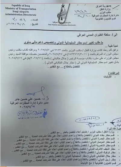 وبحسب وثيقة رسمية، فإن المدير العام لإدارة المطارات العراقية، حسين علي حسين جابر، وجه كتاباً في السابع من شهر أيلول الجاري إلى سلطة الطيران المدني لتغيير الاسم من مطار السليمانية الدولي إلى مطار جلال الطالباني.