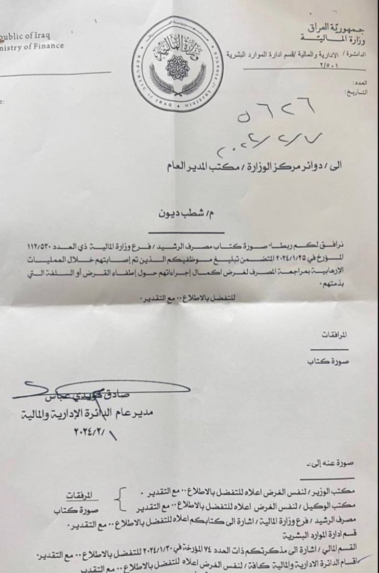 وحسب الوثيقة، اطلعت وكالة النبأ على نسخة منها، أن تبليغ الموظفين الذين اصيبوا خلال العمليات الارهابية بمراجعة المصرف لغرض اكمال اجراءاتهم حول اطفاء القرض او السلفة التي بذمتهم.