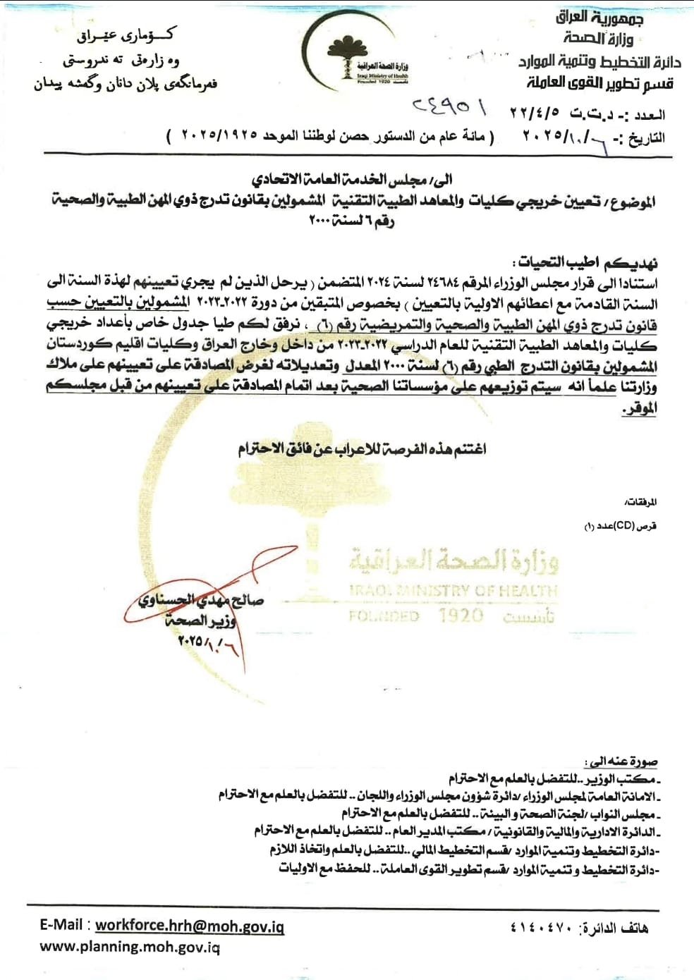 وأضاف البيان، أن الوزارة أرفقت مع الطلب جداول تفصيلية بأعداد خريجي كليات المجموعة الطبية داخل وخارج العراق، وكليات التمريض والمعاهد التقنية الطبية للعام الدراسي 2022-2023، بغية شمولهم ضمن العناوين الوظيفية المطلوبة وتخصيص التمويل المالي اللازم لتعيينهم.