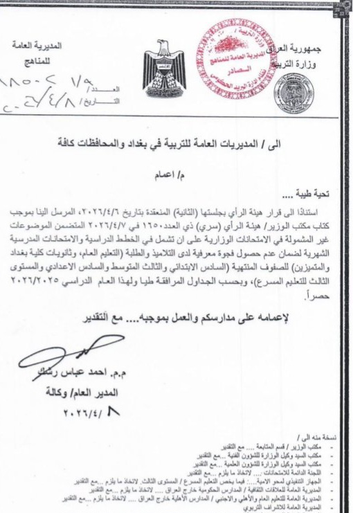 أعلنت وزارة التربية العراقية، اليوم الأربعاء، جداول الموضوعات غير المشمولة بالامتحانات الوزارية للعام الدراسي 2025–2026، الخاصة بالصفوف المنتهية والتعليم المسرّع.