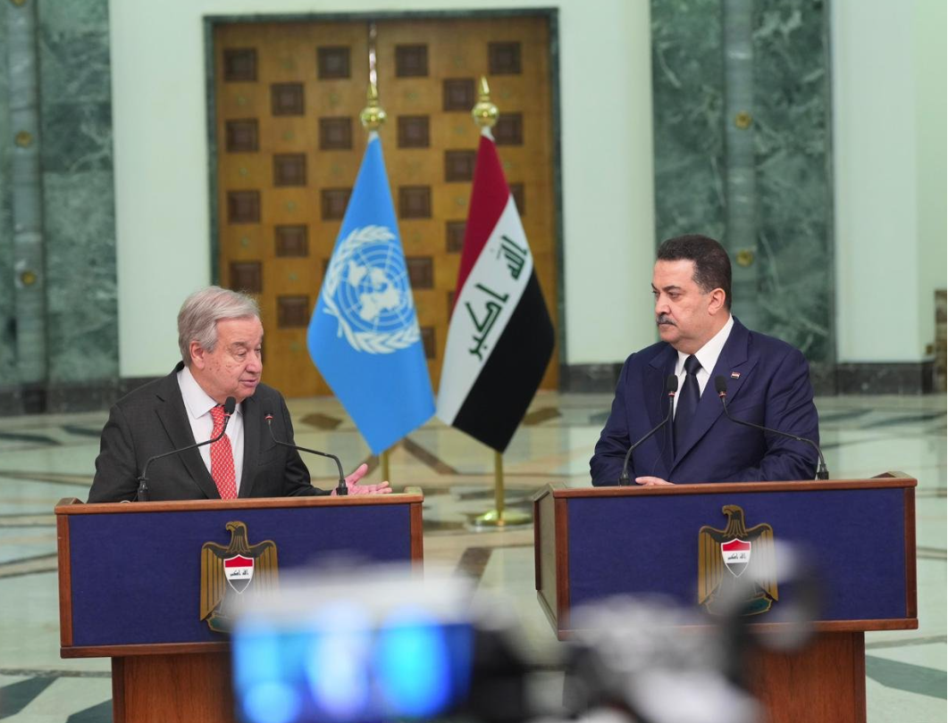 وقال غوتيريش في مؤتمر صحفي مشترك مع رئيس مجلس الوزراء محمد شياع السوداني إن "العراق أرض الحضارة والتاريخ والإنسانية، وقد شهدنا شجاعته وثباته وإصراره في التغلب على الإرهاب والتدخل الخارجي والطائفية"، مشيراً إلى أنه "نُقدّر التزام العراق بإعادة مواطنيه من مخيم الهول".