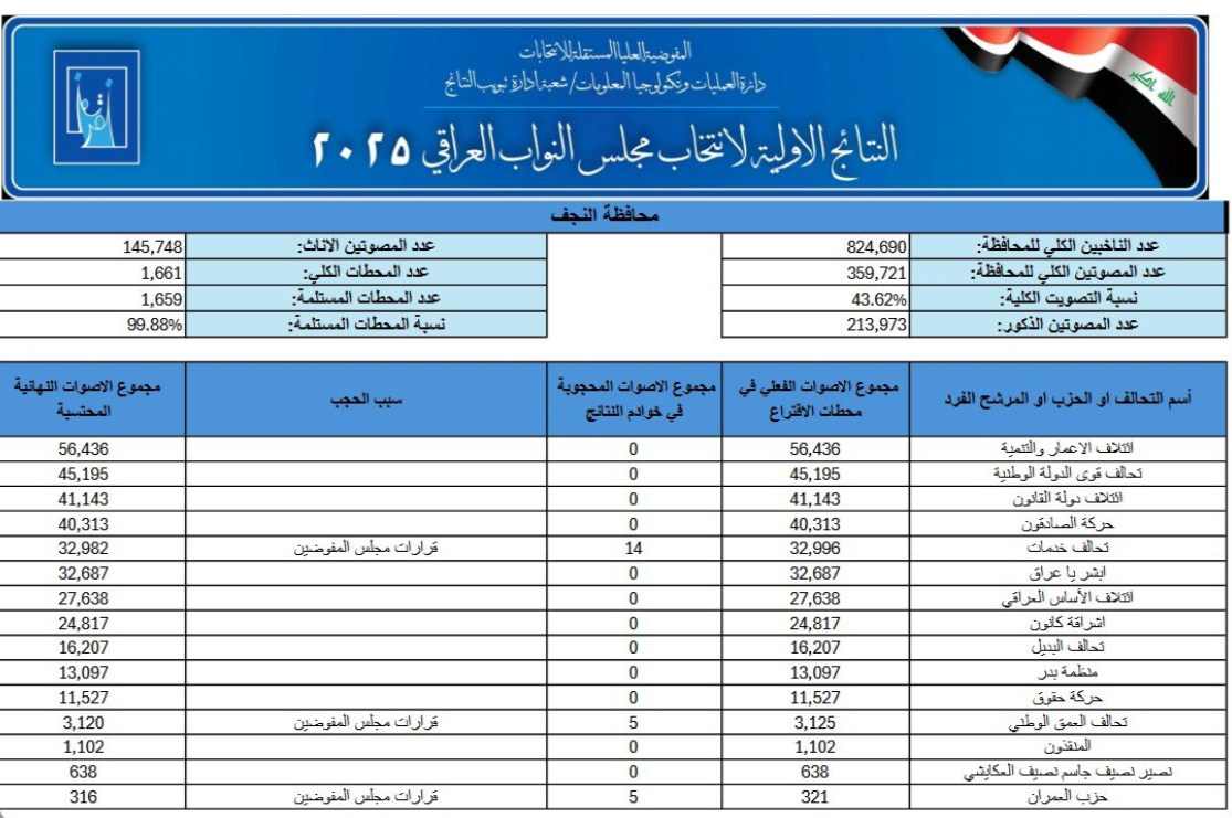 النتائج الأولية للانتخابات النيابية في محافظة كربلاء