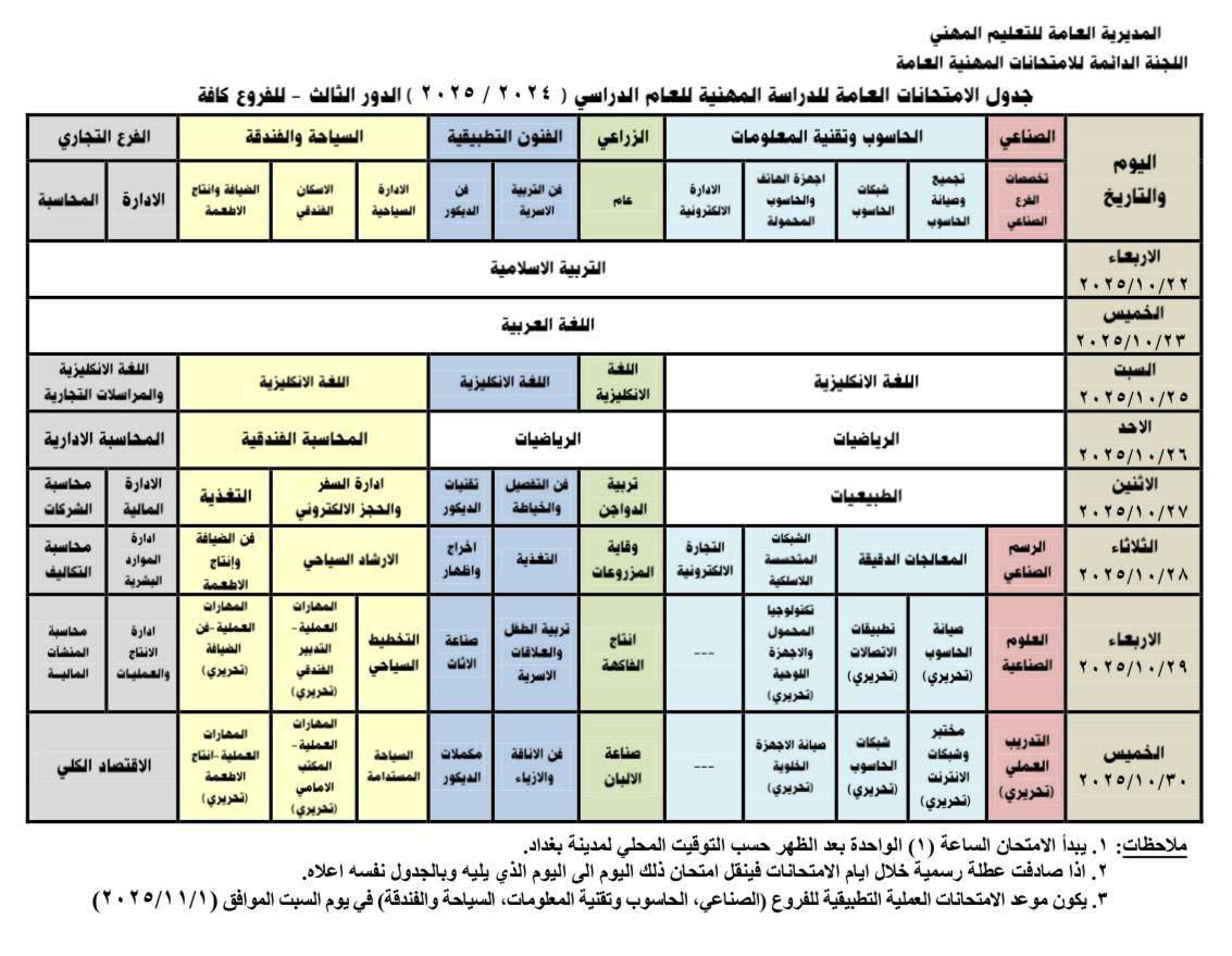 أعلنت المديرية العامة للتعليم المهني التابعة لوزارة التربية، اليوم الخميس، عن جدول الامتحانات العامة للدراسة المهنية/ الدور الثالث للعام الدراسي 2024-2025، للفروع كافة.