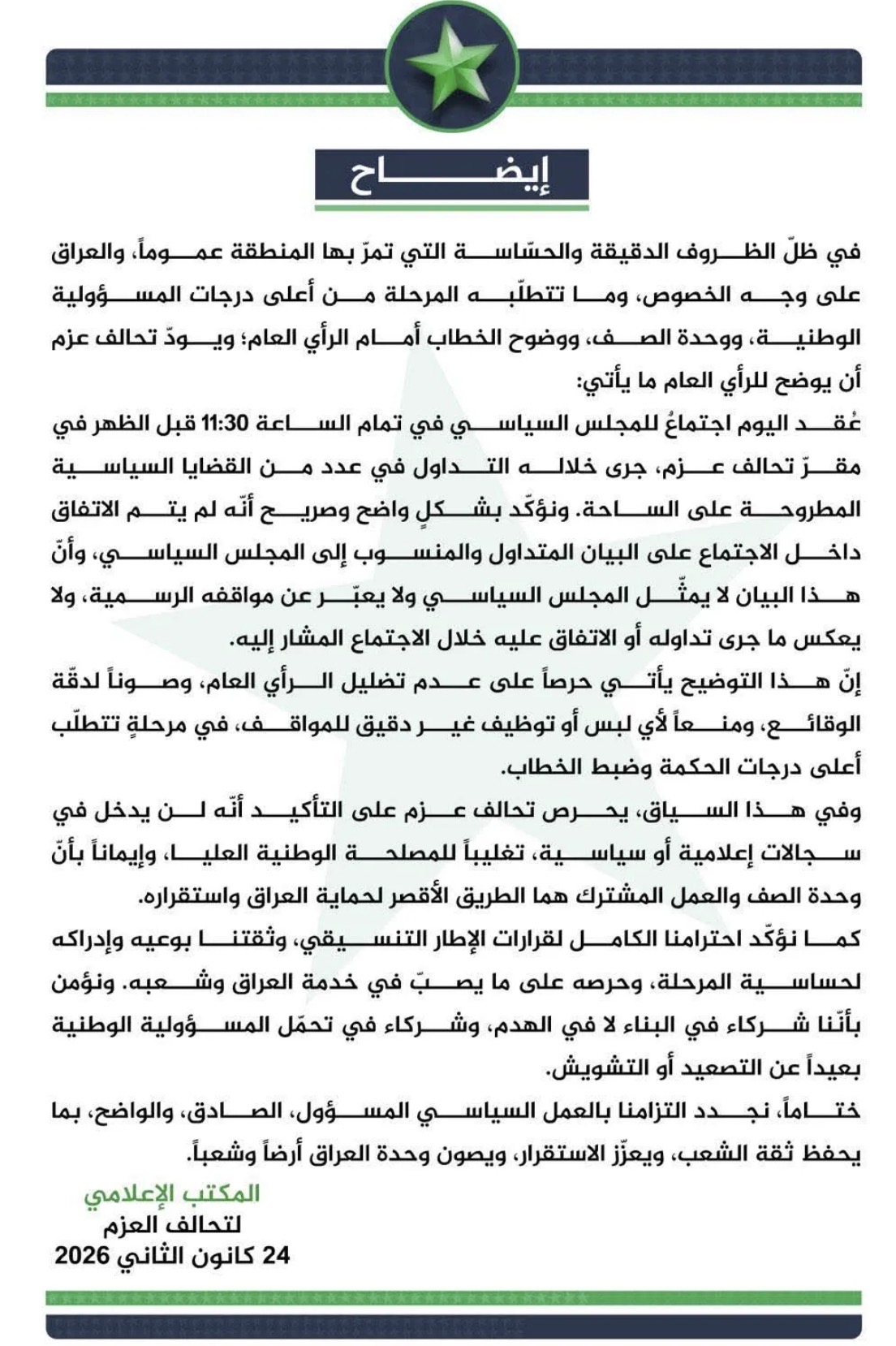 قال تحالف والعزم، اليوم السبت، بأن بيان المجلس السياسي لا يمثل رأي جميع الأعضاء بل يعكس وجهة نظر من أصدره .ع ع