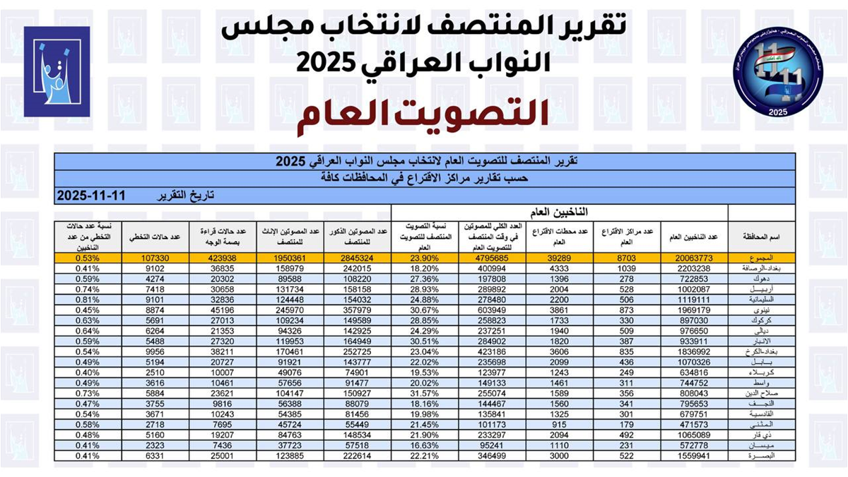 أعلنت المفوضية العليا المستقلة للانتخابات، في تقريرها الخاص بمنتصف يوم الاقتراع العام لانتخابات مجلس النواب العراقي لعام 2025، أن نسبة المشاركة في التصويت حتى منتصف اليوم بلغت 23.90% من مجموع الناخبين المسجلين.