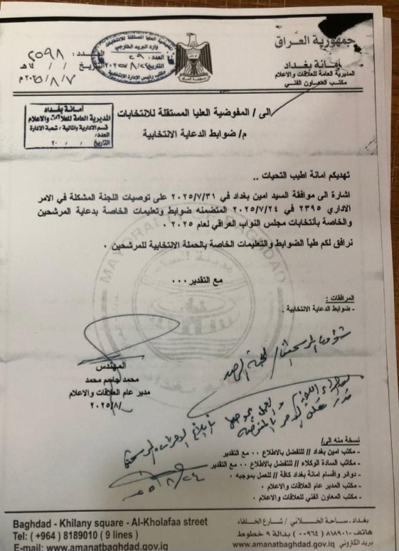 ووفقاً للكتاب الرسمي الصادر عن المديرية العامة للعلاقات والإعلام في أمانة بغداد والموجّه إلى المفوضية العليا المستقلة للانتخابات، فإن الضوابط أُقرت بموافقة أمين بغداد بتاريخ 31/7/2025، استناداً إلى توصيات اللجنة المختصة الخاصة بتنظيم الدعاية الانتخابية.