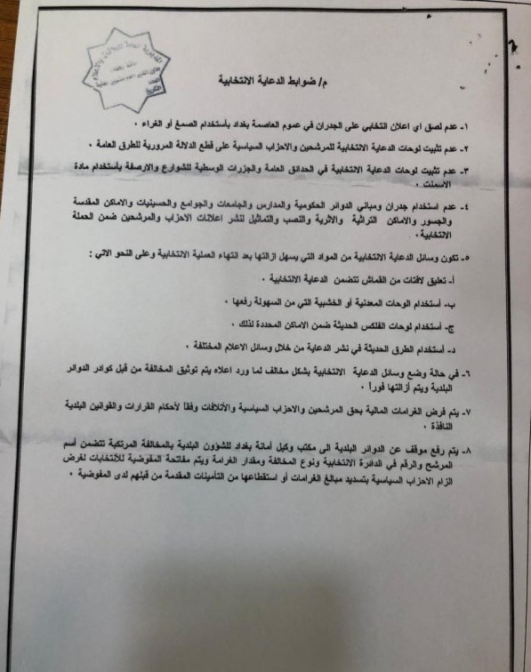 كما شددت على عدم استخدام جدران الدوائر الحكومية والمدارس والجامعات والجوامع والحسينيات والأماكن المقدسة في الحملات الانتخابية.