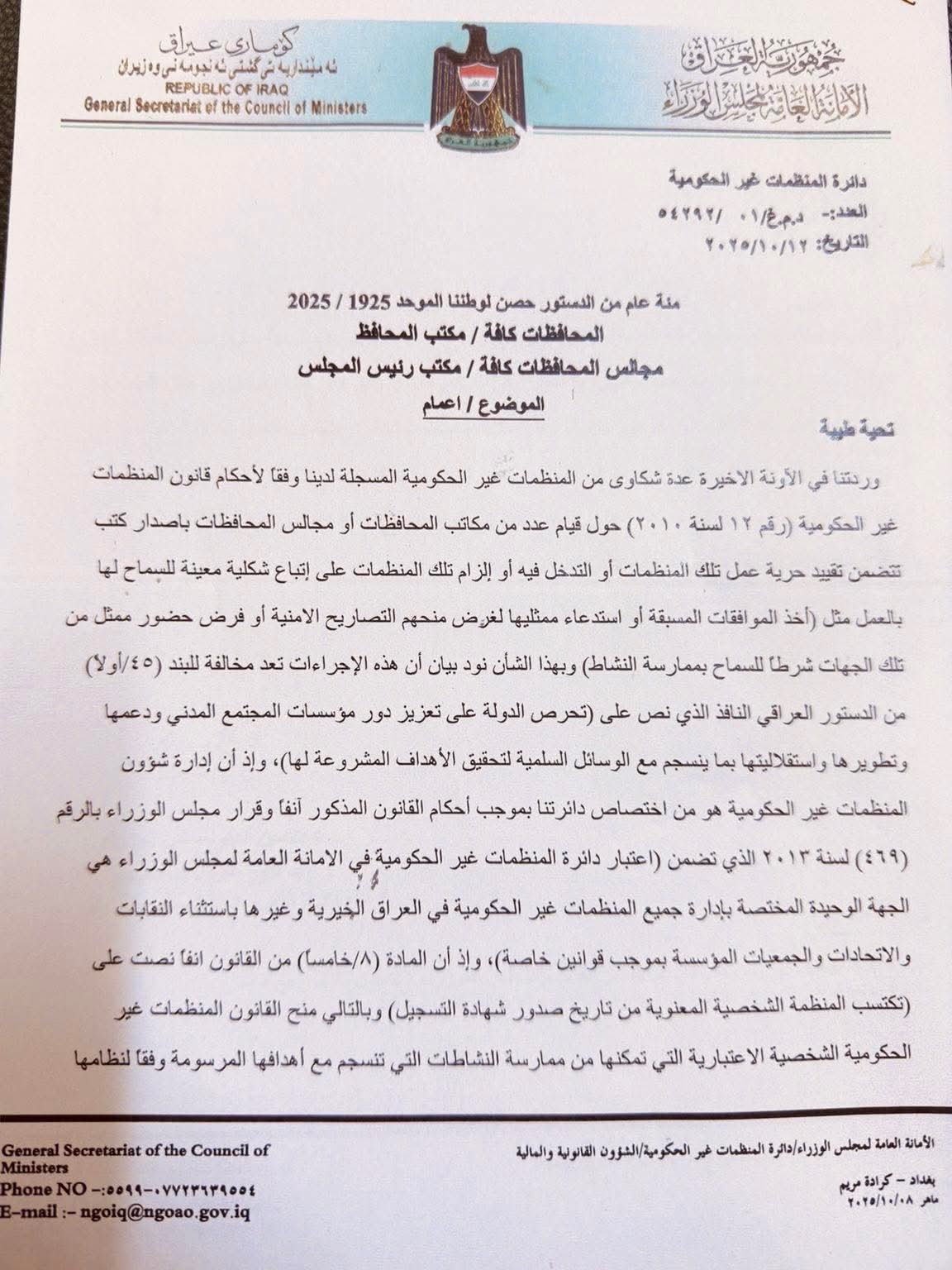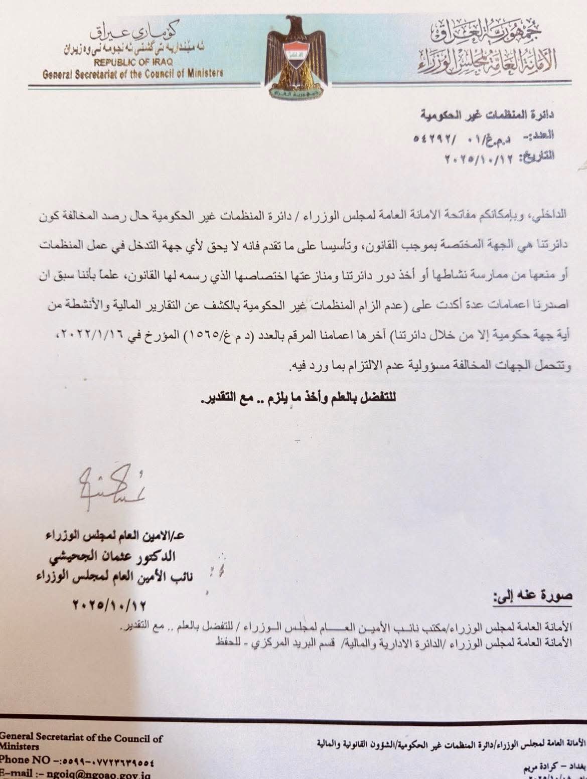وجّهت الأمانة العامة لمجلس الوزراء جميع المحافظات ومكاتب المحافظين والجهات الأمنية بعدم التدخل في عمل المنظمات غير الحكومية المسجّلة رسمياً، مؤكدة أن أي إجراء يفرض شروطاً إضافية على عمل تلك المنظمات يُعدّ مخالفة قانونية صريحة.