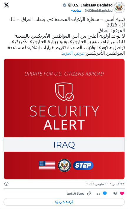 وأضاف البيان أن" إيران والجماعات المسلحة المتحالفة معها ما تزال تشكل تهديداً كبيراً للسلامة العامة، داعياً المواطنين الأمريكيين إلى الحفاظ على مستوى منخفض من الظهور والابتعاد عن المناطق التي قد تجعلهم أهدافاً محتملة".