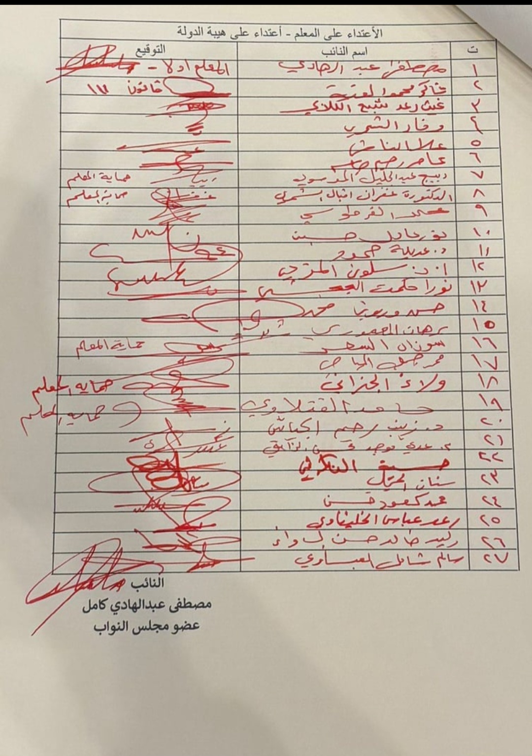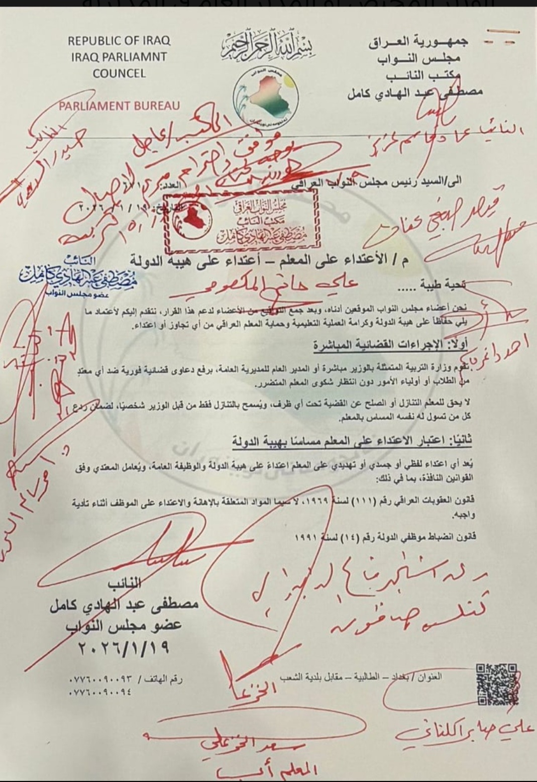 وقّع عدد من أعضاء مجلس النواب، اليوم الاثنين، مقترحاً رسمياً قُدّم إلى رئاسة البرلمان، يتضمن اتخاذ إجراءات قانونية بحق الطلبة أو أولياء الأمور المتورطين بالاعتداء على الملاكات التعليمية.