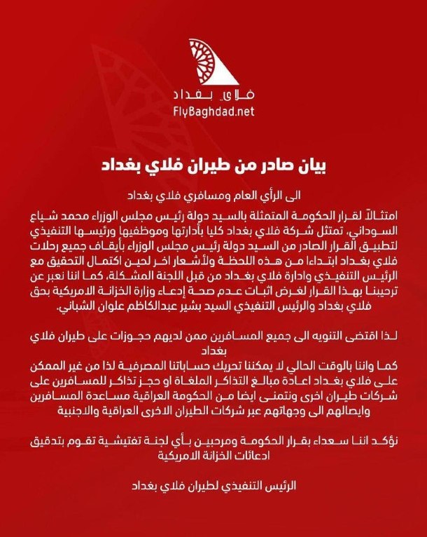 اعلنت شركة فلاي بغداد للطيران، تعليق رحلاتها كافة حتى إشعار آخر، لحين اكتمال التحقيق. كما موضح في نص البيان ادناه: ع. ش