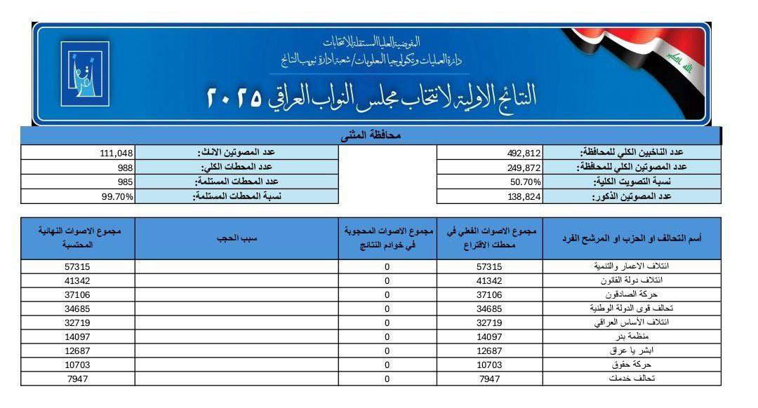النتائج الأولية للانتخابات النيابية في محافظة ديالى