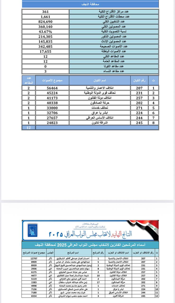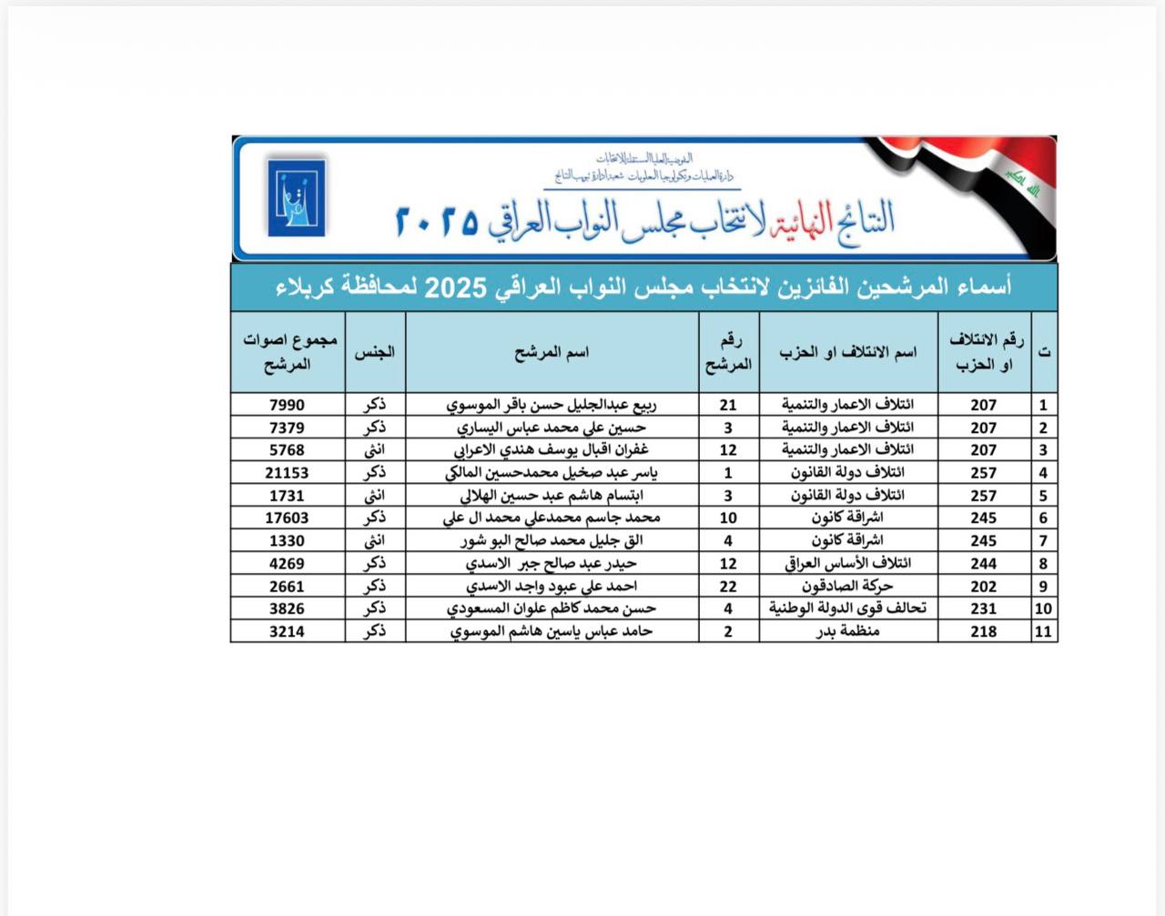 النتائج النهائية للانتخابات البرلمانية في محافظة كربلاء المقدسة