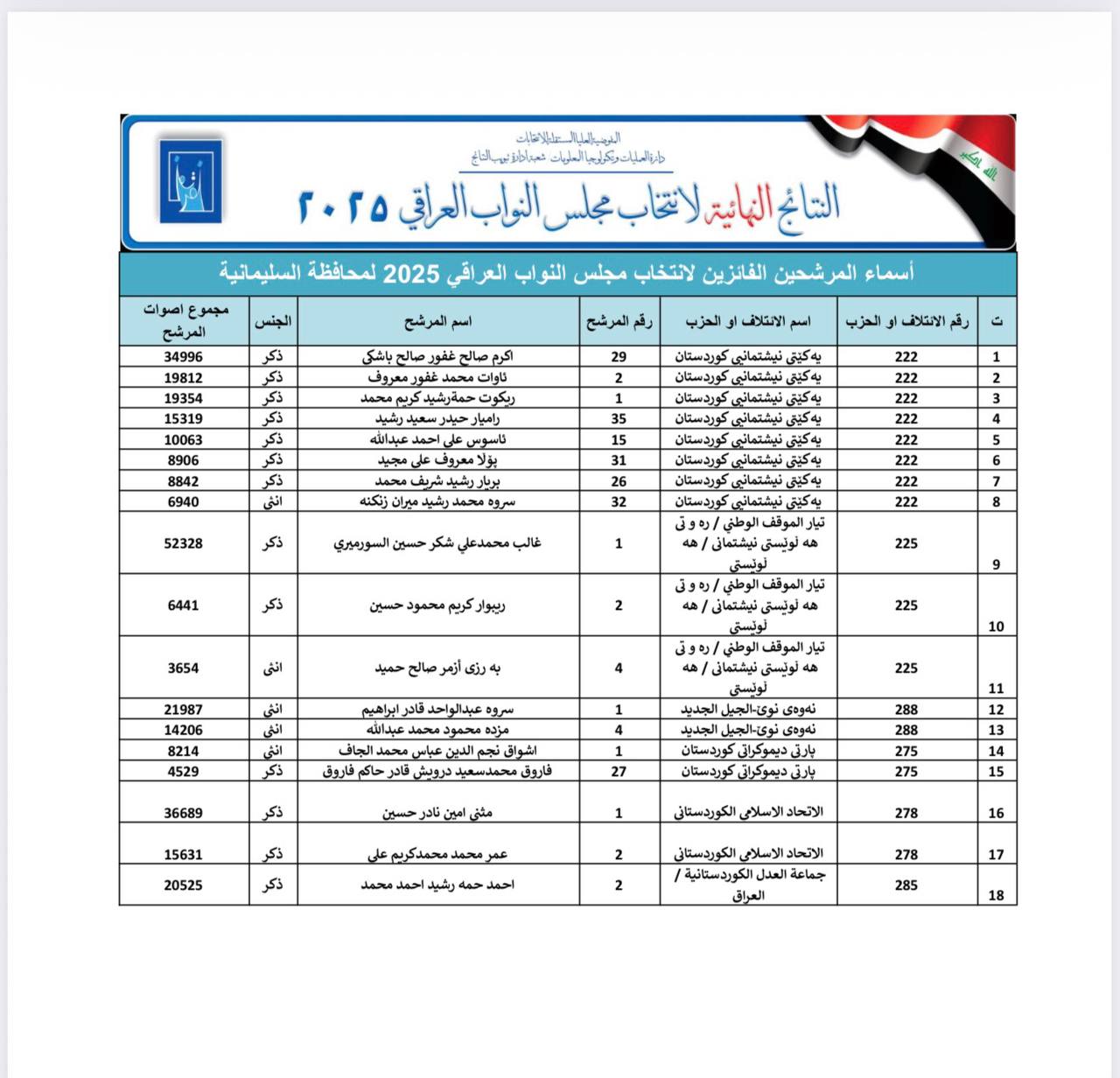 النتائج النهائية للانتخابات البرلمانية في محافظة السليمانية
