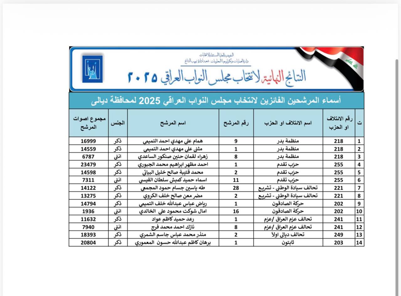 النتائج النهائية للانتخابات البرلمانية في محافظة ديالى