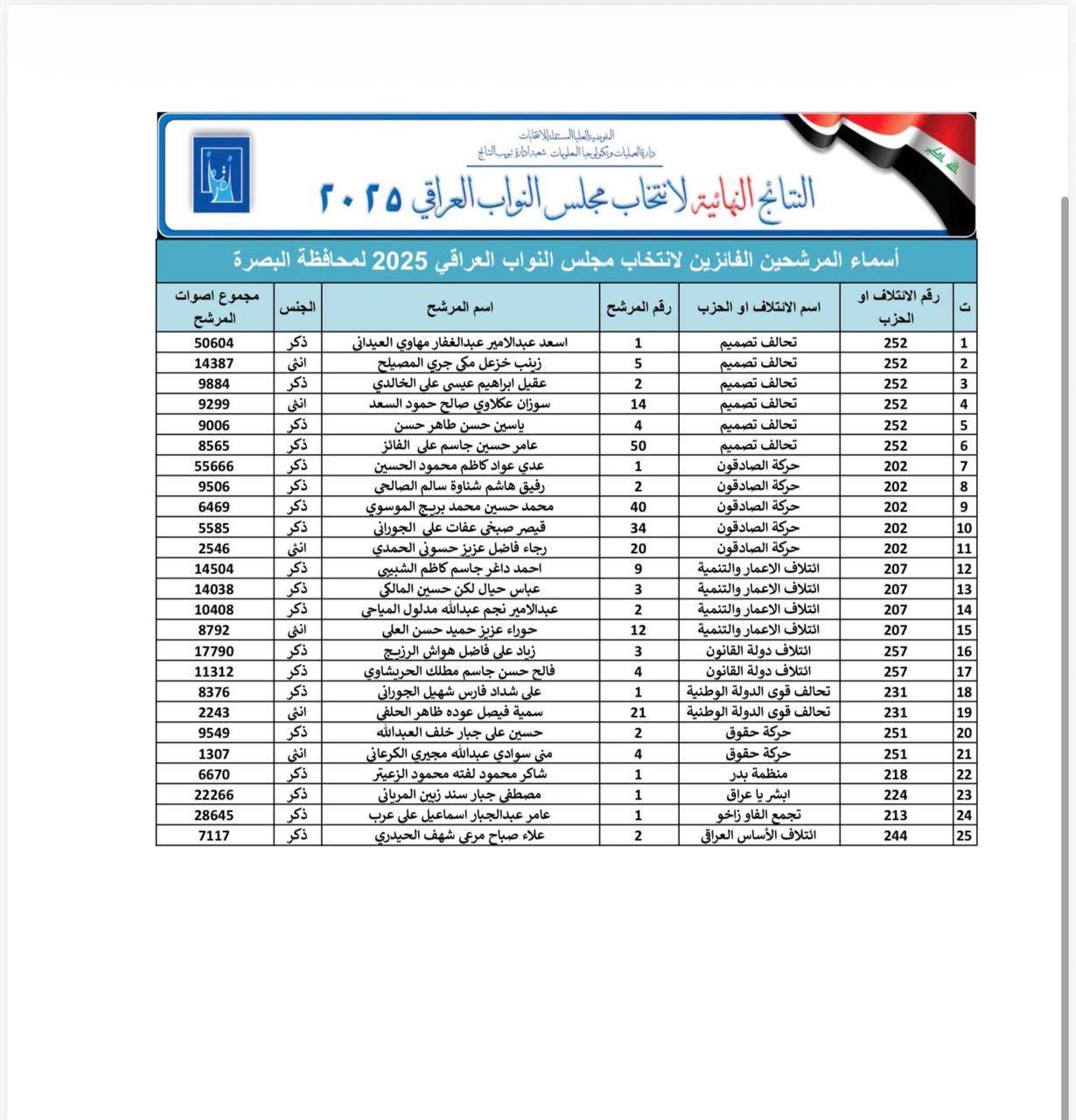 النتائج النهائية للانتخابات البرلمانية في محافظة البصرة