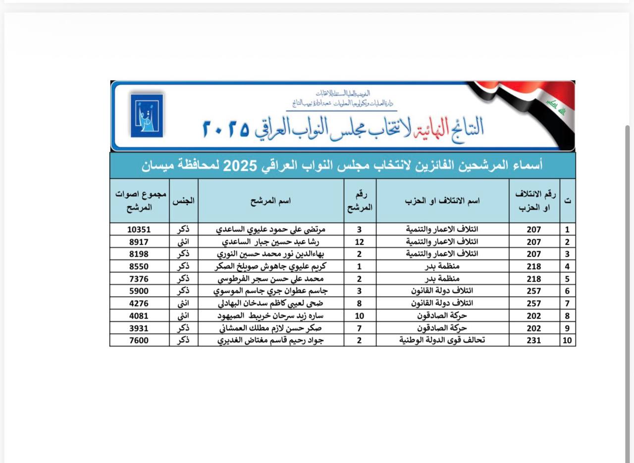 النتائج النهائية للانتخابات البرلمانية في محافظة ميسان