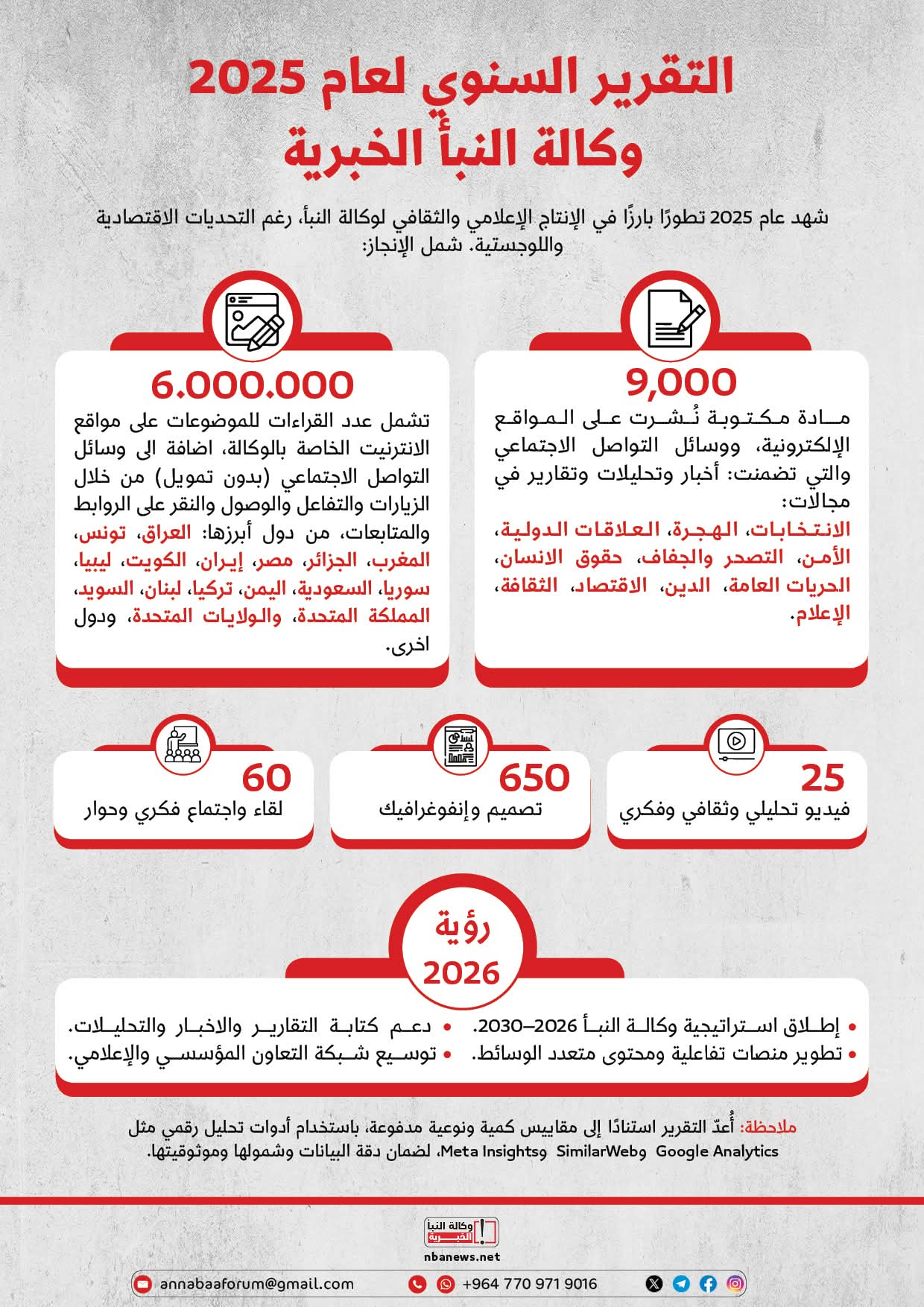 وأشار التقرير إلى أن إعداد هذه البيانات استند إلى مقاييس كمية ونوعية مدفوعة، باستخدام أدوات تحليل رقمي متخصصة مثل Google Analytics وSimilarWeb وMeta Insights، بما يضمن دقة المعلومات وشمولها وموثوقيتها.