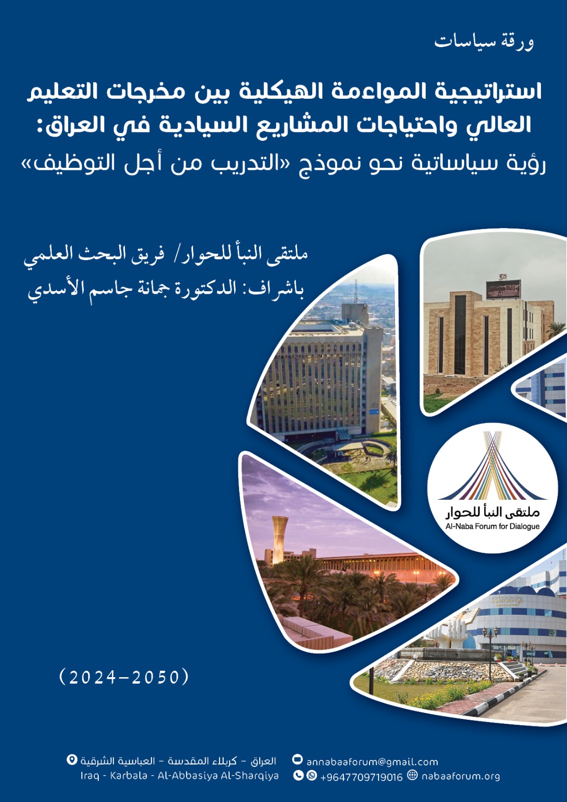 أصدر ملتقى النبأ للحوار، عبر فريقه البحثي، ورقة سياسات جديدة بعنوان "استراتيجية المواءمة الهيكلية بين مخرجات التعليم العالي واحتياجات المشاريع السيادية في العراق: رؤية سياساتية نحو نموذج التدريب من أجل التوظيف (2024-2050)"، بإشراف الدكتورة جمانة جاسم الأسدي، وذلك ضمن سلسلة أوراق السياسات الصادرة في 18 نيسان/أبريل 2026.
