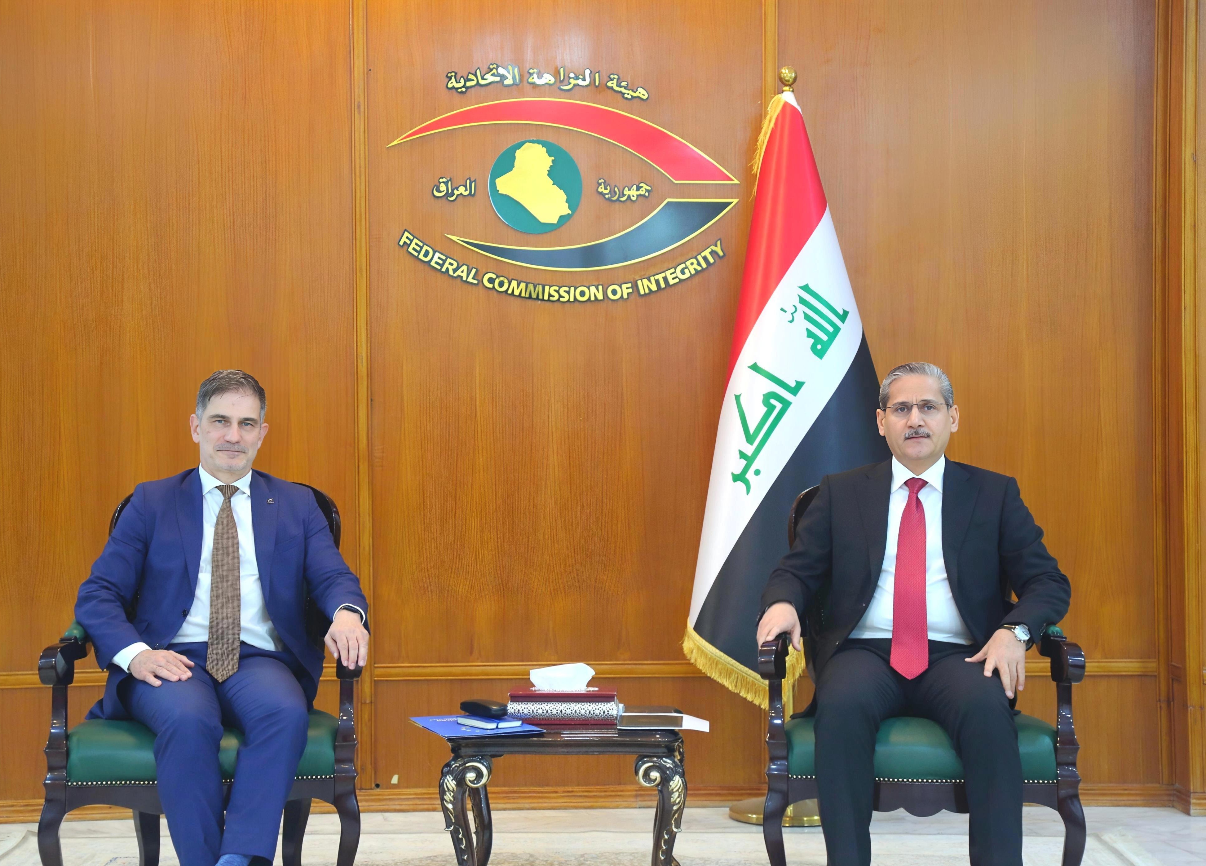 بحث رئيس هيئة النزاهة الاتحاديَّة، محمد علي اللامي، اليوم الخميس، مع سفير الاتحاد الأوروبي لدى العراق، توماس سيلر، سبل تعزيز الشراكات الدولية ودعم مشاريع مكافحة الفساد.