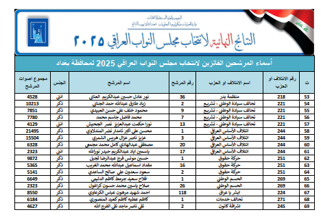 وقالت المفوضية في المؤتمر الصحفي لإعلان النتائج النهائية وتابعته وكالة النبأ أن "نسبة التصويت في العاصمة بغداد تجاوزت 48%، ووزعت المقاعد على القوائم والتحالفات على النحو التالي: