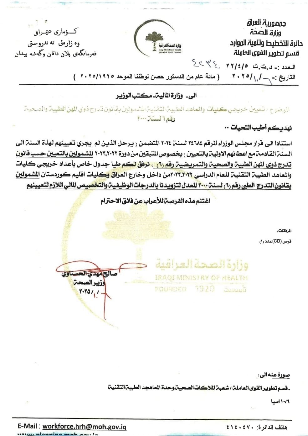 وأضاف البيان، أن الوزارة أرفقت مع الطلب جداول تفصيلية بأعداد خريجي كليات المجموعة الطبية داخل وخارج العراق، وكليات التمريض والمعاهد التقنية الطبية للعام الدراسي 2022-2023، بغية شمولهم ضمن العناوين الوظيفية المطلوبة وتخصيص التمويل المالي اللازم لتعيينهم.