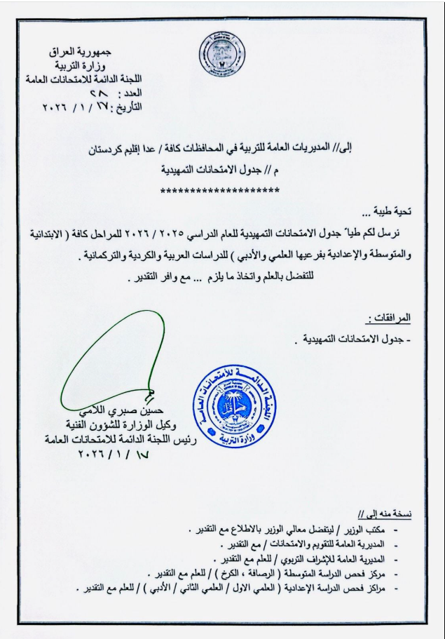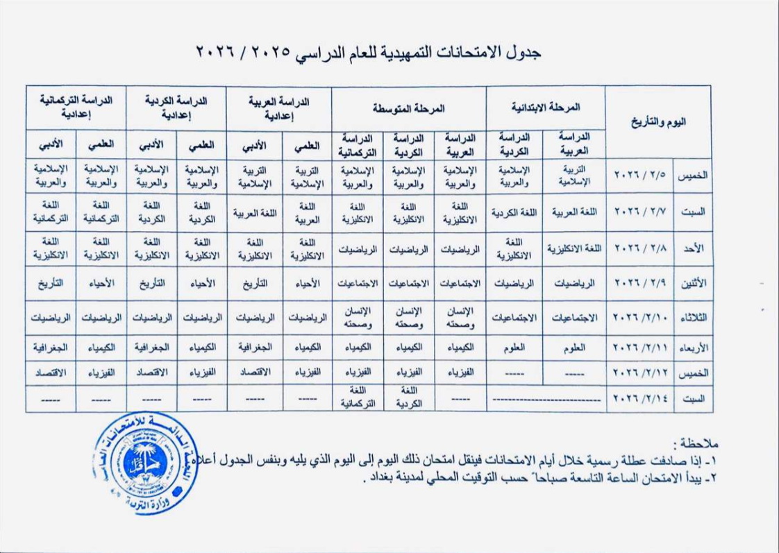 أعلنت وزارة التربية، اليوم السبت، جدول الامتحانات التمهيدية للعام الدراسي 2025 / 2026.وذكر بيان للوزارة، انها "تُعلن جدول الامتحانات التمهيدية للعام الدراسي 2025 / 2026 للمراحل الدراسية ( الابتدائي والمتوسط والاعدادي )".ادناه الجدول:س ع