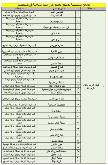 كشفت وزارة الداخلية، اليوم الثلاثاء، عن خطة تنظيم احتفالات أعياد رأس السنة الميلادية في العاصمة بغداد وعدد من المحافظات، محددةً المواقع المعتمدة لإقامة الفعاليات الرسمية والشعبية.