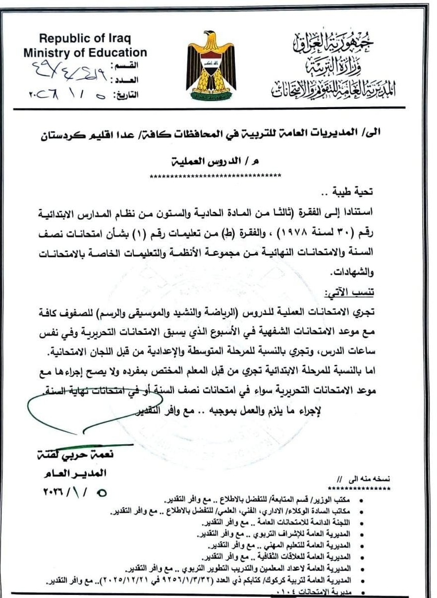 ويأتي هذا التوجيه في إطار تنظيم العملية الامتحانية وضمان انسيابها بما يحقق العدالة للطلبة ويخفف من الضغط خلال فترة الامتحانات.