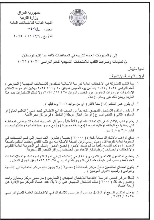وبيّنت الوزارة أن التقديم للامتحانات التمهيدية للدراسة الإعدادية يشترط إنهاء المرحلة المتوسطة أو ما يعادلها بنجاح.