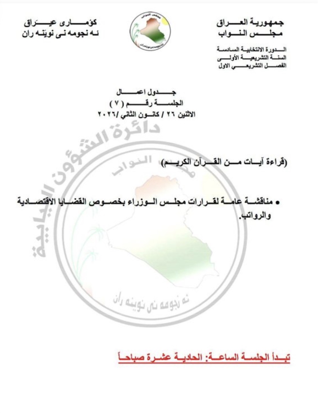 نشرت الدائرة الإعلامية لمجلس النواب، اليوم الأحد، جدول أعمال جلسة يوم غدٍ الاثنين، فيما بيّنت أن الجلسة خُصصت لمناقشة القضايا الاقتصادية والرواتب.